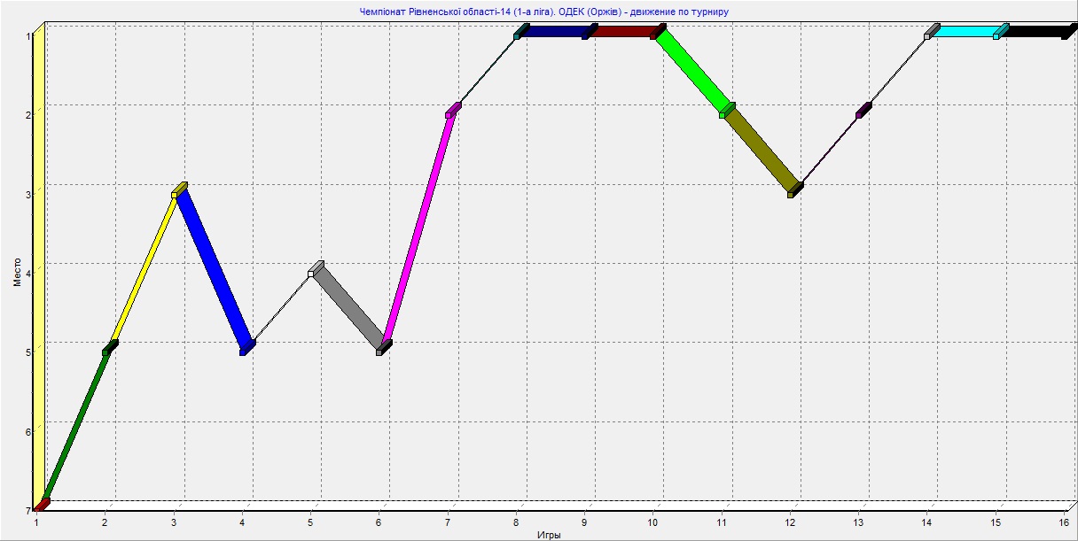 Чемпіоном області в сезоні 2014 року став удев'яте у своїй історії оржівський ОДЕК. Команда виборола друге поспіль чемпіонство, що стало третім подібним досягненням команди із Рівненського району (Оржів ставав тричі переможцем першої ліги у сезонах 2002-2004 і 2006-2008 років). Отже, якщо екстраполювати подібні досягнення в минулому на майбутнє, то у 2015 році ОДЕК має також стати чемпіоном ). Утім, шлях до перемоги у оржівців виявився важким. Достатньо відзначити, що чемпіоном у сезоні 2014 ОДЕК став, набравши лише 75% очок - таку низьку частку очок оржівці у своїх попередніх чемпіонських сезонах не набирали ще ні разу (найгірший показник до цього був у 2003 році - 80%, найкращий - у сезоні 2011 року, коли склав 88,89% від усіх можливих очок в турнірі). До речі, з меншою кількістю очок за останні 12 років команда ставала чемпіоном у 2009 році - тоді рівненська "Славія" набрала лише 72,22% очок. Графік проходження турніру: ОДЕК від самісінького початку змагань почав набирати оберти і закінчив перше коло на першому місці, щоправда, у другій частині сезону оржівці дещо опустилися та, навіть, побували на 3-ому місці, проте це було викликано пропуском поєдинків через задіяність на іншому турніру - Аматорському чемпіонаті. Як наслідок - дострокова перемога в обласному турнірі, яку ОДЕК здобув за тур до завершення змагань, перегравши у Радивилові місцевий "Сокіл" в пропущенному матчі 13 туру. |